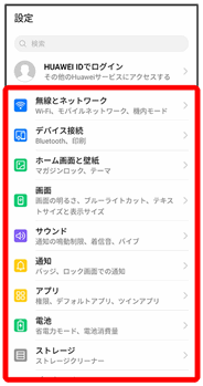 | 無線とネットワーク | Wi-Fiやモバイルネットワーク、データ通信量など、ネットワークやインターネットに関する設定ができます。 | |