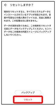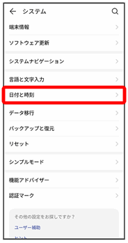 端末情報やソフトウェア更新、ナビゲーションバー、言語と文字入力、日付と時刻、バックアップ、リセットなどに関しての確認や設定ができます。