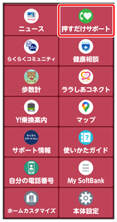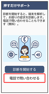 「押すだけサポート」アプリをタップするだけで、本機の症状を確認してくれます。症状を改善できない場合は、アプリから直接「ワイモバイル らくらくスマートフォン カスタマーセンター」に電話をかけることもできます。「ワイモバイル らくらくスマートフォン カスタマーセンター」への通話は無料となります。