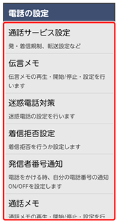 | 通話サービス設定 | 発信規制や着信規制、留守番電話・転送電話、割込通話の設定をします。 | |