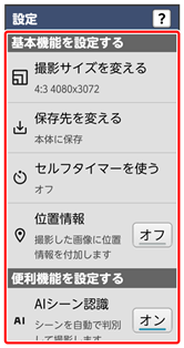 | 撮影サイズを変える | 写真の撮影サイズを設定します。 | |