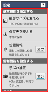- ホーム画面/ランチャー画面以外からカメラを起動した場合、設定できない項目があります。