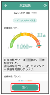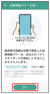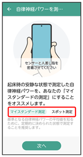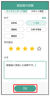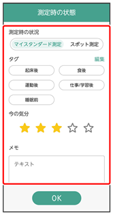 - 「測定時の状況」では、日々の記録の場合はマイスタンダード測定、今回限りの場合はスポット測定を選択します。