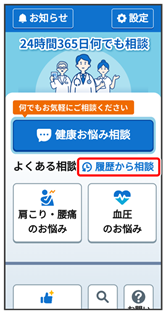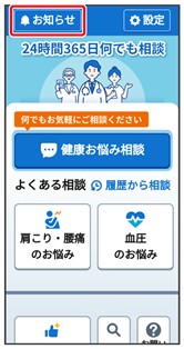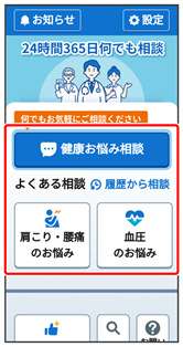 | 健康お悩み相談 | 24時間365日、チャットで健康相談ができる機能です。医師、看護師、薬剤師などに直接相談できます。 健康に関するさまざまな相談に対応しています。 |