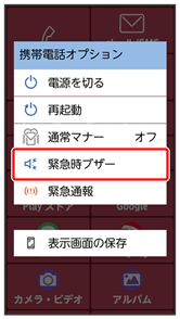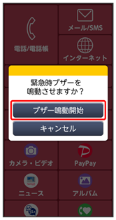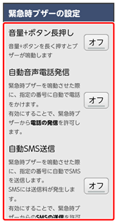 - ロック解除方法をロックなし以外に設定している場合、本機を起動してから1度も画面ロックを解除していないときは、ブザーは鳴りますが自動音声電話発信/自動SMS送信は動作しません。