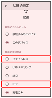 | PTP | 本機のデータをパソコンとやりとりすることができます。パソコンがMTPに対応していない場合、このモードを利用してください(PTPモード)。 | |