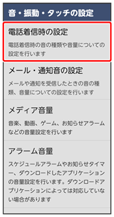 | 電話着信時の設定 | 電話着信時の着信音や音量などを設定します。 | |