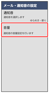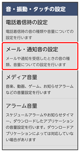 | メール・通知音の設定 | メールなど受信したときの通知音と音量を設定します。 | |