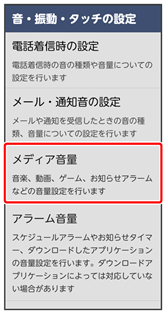 | メディア音量 | 音楽や動画、ゲームなどの音量を設定します。 | |