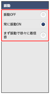 - 振動OFF/常に振動ON/まず振動で徐々に着信音