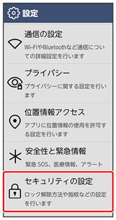 ロック解除方法や指紋認証など、セキュリティに関する設定ができます。