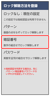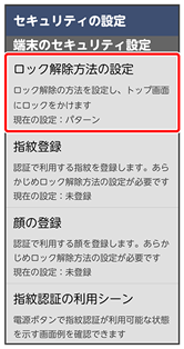 | ロック解除方法の設定 | 画面ロックの解除方法を設定します。 | |