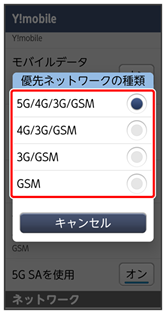 - お買い上げ時は5G/4G/3G/GSMに設定されています。日本国内や3G/GSMネットワークの通信事業者のみの地域で本機を使用する場合は設定を変更する必要はありません。