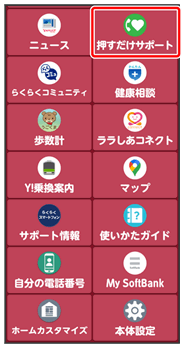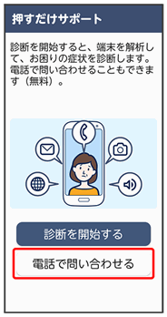 「押すだけサポート」アプリをタップするだけで、本機の症状を確認してくれます。症状を改善できない場合は、アプリから直接「ワイモバイル らくらくスマートフォン カスタマーセンター」に電話をかけることもできます。「ワイモバイル らくらくスマートフォン カスタマーセンター」への通話は無料となります。