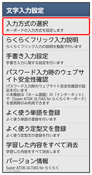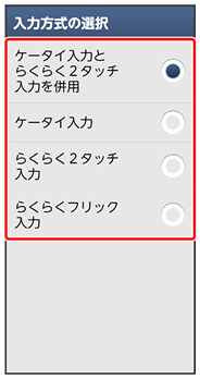 入力方法には、「ケータイ入力とらくらく2タッチ入力を併用」と「ケータイ入力」、「らくらく2タッチ入力」、「らくらくフリック入力」があります。