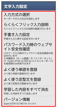 | 設定 | Super ATOK ULTIAS for らくらくに関する設定項目を表示します。 詳しくは、「文字入力の設定を行う」を参照してください。 |