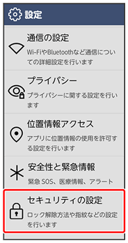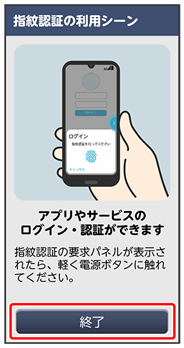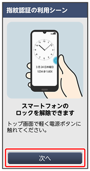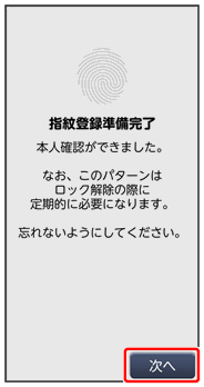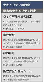 - セキュリティ解除方法を指紋認証に設定しても、72時間ごとおよび本機起動時には予備のセキュリティ解除方法で画面ロックを解除する必要があります。予備のセキュリティ解除方法をお忘れにならないようご注意ください。