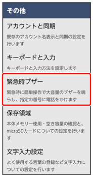 緊急時ブザーは、緊急時などに大音量のブザーを鳴らすことができる機能です。ブザーを鳴らしたとき、自動で電話をかけたり(自動音声電話発信)、SMSを送信できます(自動SMS送信)。