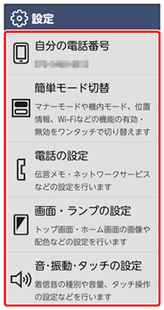 | 電話の設定 | 通話サービスや迷惑電話対策など、電話に関する設定ができます。 | |