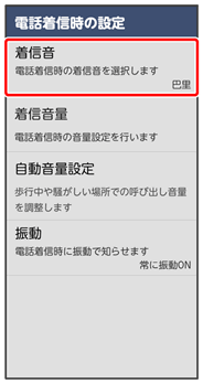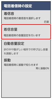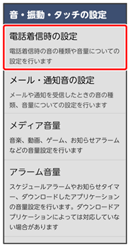| 電話着信時の設定 | 電話着信時の着信音や音量などを設定します。 | |