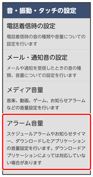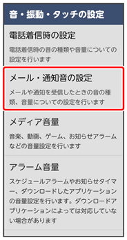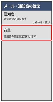 | メール・通知音の設定 | メールなど受信したときの通知音と音量を設定します。 | |
