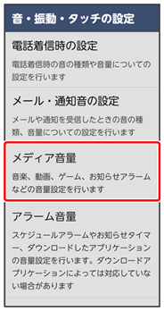 | メディア音量 | 音楽や動画、ゲームなどの音量を設定します。 | |
