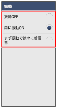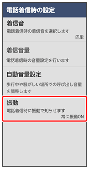 | マナーモード時の振動 | マナーモード中の着信時に本機を振動させるかどうかを設定します。 | |