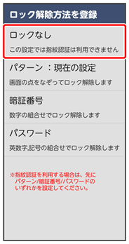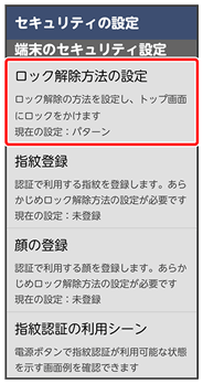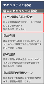 | ロック解除方法の設定 | 画面ロックの解除方法を設定します。 | |