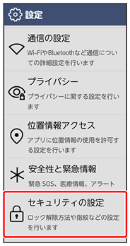 ロック解除方法や指紋認証など、セキュリティに関する設定ができます。