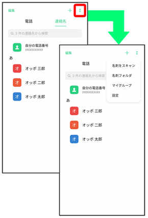 をタップすると、その画面で利用できる機能の設定や項目が画面に表示されます。