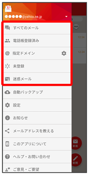 • ↓すべてのメール電話帳登録済み指定ドメイン未登録迷惑メール