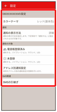 | 未登録 | 電話帳に未登録の相手からメールを受信したときの通知方法を設定します。 | |