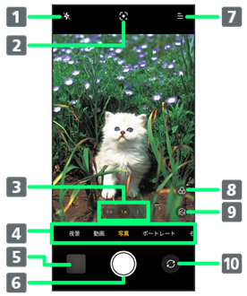 ロングタッチして目盛を左右にドラッグしても、ズーム倍率を切り替えられます。 - 撮影モード切り替え