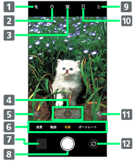 インカメラ/アウトカメラを切り替えます。 - フラッシュライトボタン