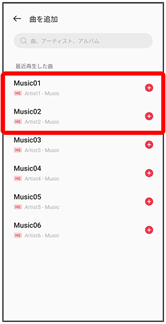 - プレイリストをタップすると、最近再生した曲やプレイリストが一覧で表示されます。リストをタップしてから、曲名をタップすると曲が再生されます。