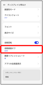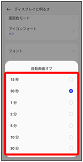 | 自動画面オフ | 操作を行わなかった場合に画面消灯する時間を設定します。 | |