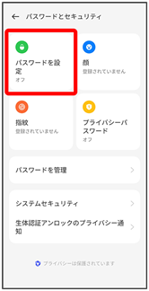 | ロック画面パスワード | 画面ロックを解除するための暗証番号です。 詳しくは、「パスワードで画面ロックを解除するように設定する」を参照してください。 |