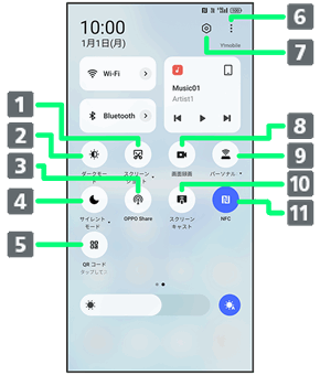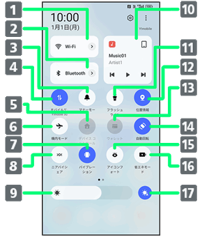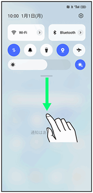 通知バーを下にフリック/スワイプすると、コントロールセンターを開くことができます。コントロールセンターでは、アイコンをタップして機能のON/OFFなどを設定できます。