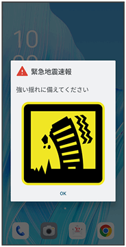 メッセージが表示され、緊急地震速報/災害・避難情報個別の警告音およびバイブレータでお知らせします。