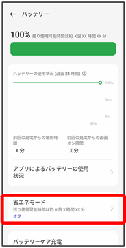 | アプリによるバッテリーの使用状況 | 過去24時間のバッテリー使用量および使用時間をアプリごとに確認できます。また、バッテリー持続時間を延ばすための設定変更ができます。 | |