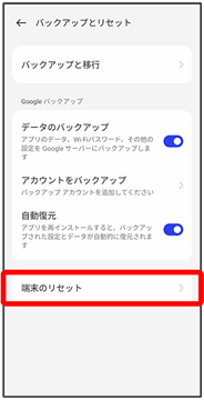 | バックアップとリセット | SDカードを使用したデータの保存や読み込み、Google アカウントを使用したバックアップの設定、システム/アプリおよび初期状態へのリセットができます。 |