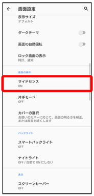 | サイドセンスバーの操作範囲 | ・有効にする側面 サイドセンスを有効にする側面を設定します。 ・サイドセンスを一時的に無効にする 画面操作中の誤操作防止のため、画面タップ中にサイドセンスバーを非表示にするかどうかを設定します。 ・長さ サイドセンスバーの長さを設定します。 ・透明度 サイドセンスバーの透明度を設定します。 ・位置 サイドセンスバーの位置を設定します。 ・スライダーの値をリセット 長さ、透明度、位置の設定をリセットします。 |