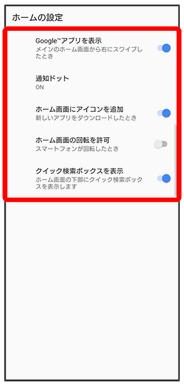 | Google™アプリを表示 | 最初のホーム画面の左のシートに、Google アプリを表示するかどうかを設定します。 | |