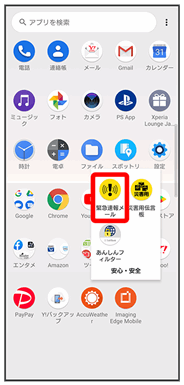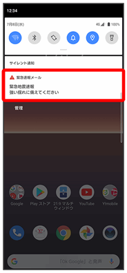 とメッセージが表示され、緊急地震速報の警告音/津波警報、災害・避難情報の専用着信音およびバイブレーションでお知らせします。