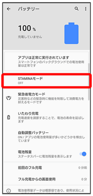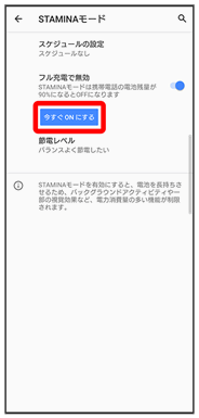 | STAMINAモード | バックグラウンド通信や一部の視覚効果など、電力消費量の多い機能を制限して電池を長持ちさせるように設定できます。 | |