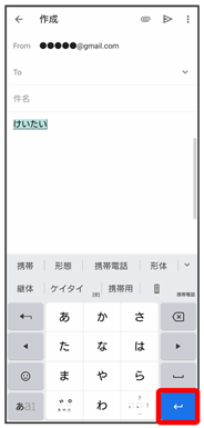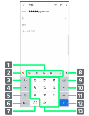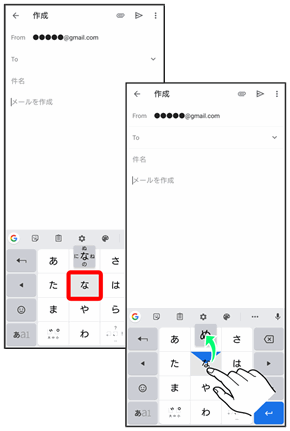 キーを上下左右にフリックすることで、キーを繰り返しタップすることなく、入力したい文字を入力できます。キーに触れると、フリック入力で入力できる候補が表示されます。入力したい文字が表示されている方向にフリックすると、文字が入力されます。