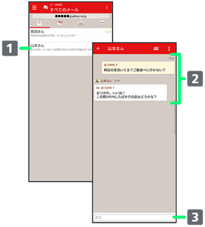 会話型表示では、宛先ごとに送受信したメールをまとめて表示します。たとえば、山本さんとやりとりしたメールを確認するときは、1つのスレッドの中で山本さんと会話をしているように表示されます。