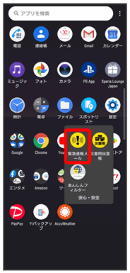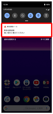 とメッセージが表示され、緊急地震速報の警告音/津波警報、災害・避難情報の専用着信音およびバイブレーションでお知らせします。