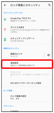 - 指紋認証が20回連続して認識されなかった場合は、指紋認証センサーが無効になります。画面を上にフリックして設定した画面ロック解除方法を入力してください。