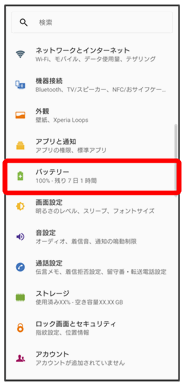 | 詳細設定 | ・電池残量(パーセンテージ) ステータスバーに電池残量を表示するかどうかを設定できます。 ・自動調整バッテリー 自動調整バッテリー機能を利用するかどうかを設定します。 ・前回のフル充電 前回のフル充電から経過した時間を確認できます。 ・フル充電からの画面使用 フル充電以降の画面の電池使用状況を確認できます。 ・前回のフル充電から使用 前回のフル充電からの電池の使用状況を確認できます。 |